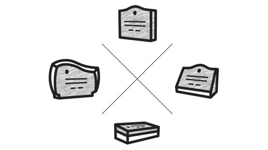 We offer a range of optional shapes for both headstones and markers. A few examples of styles we offer are Serptop, Bevel, Slant, Grass and Upright. We also offer Custom shapes, allowing a more personalized touch.